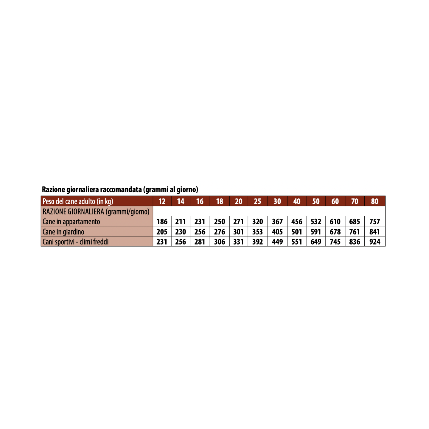 • Componenti Analitici: Proteina grezza: 25%, Fibra grezza: 2,2%, Grassi grezzi: 16%, Ceneri grezze: 7,5%. Calcio: 1,6%, Fosforo: 1,2%, Acidi Grassi Omega-3: 0,6%, Acidi Grassi Omega-6: 4%. Energia Metabolizzabile: 4.100 kcal/kg.