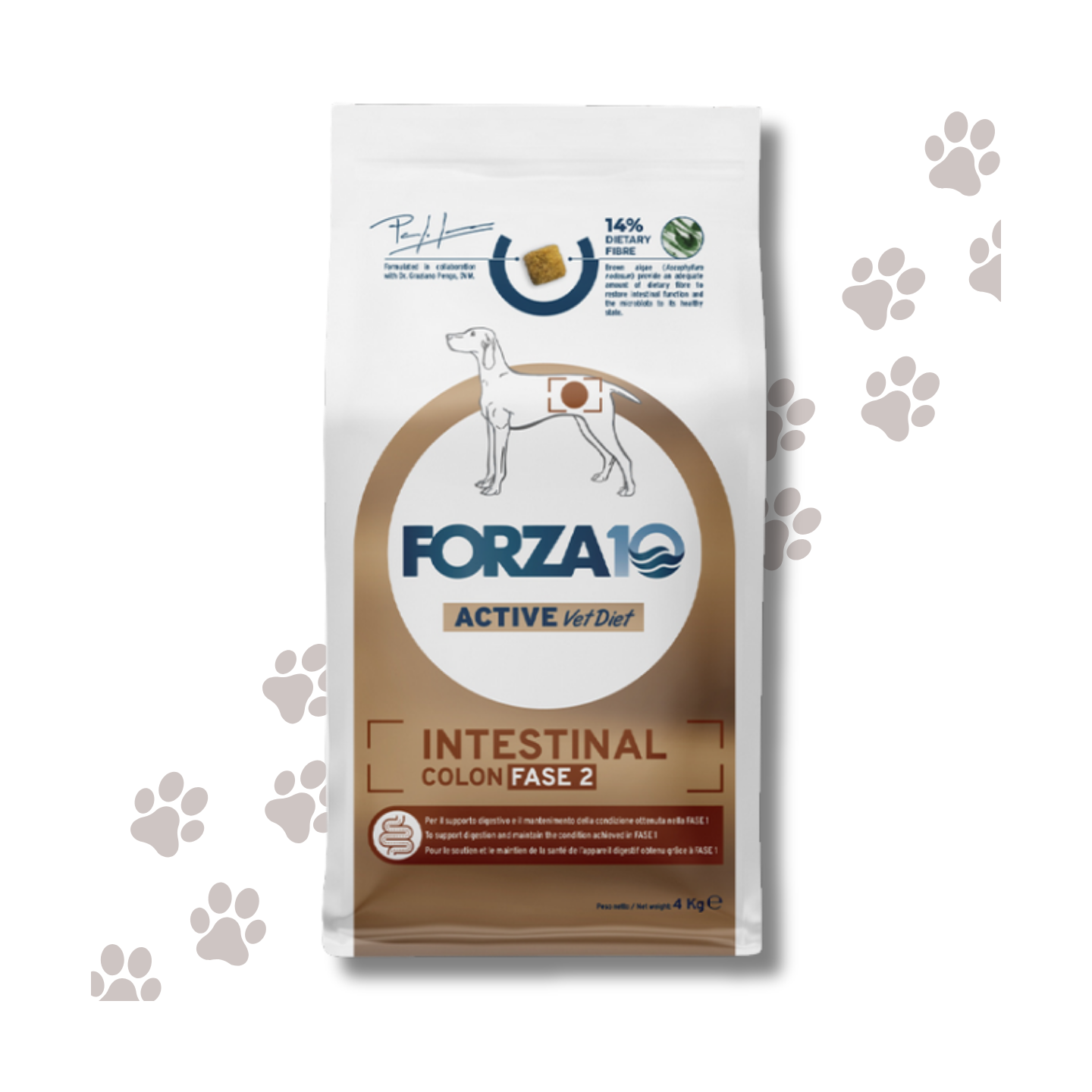 FORZA10 Intestinal Colon Fase II è un alimento dietetico completo formulato per il recupero nutrizionale e il supporto della funzione intestinale nei cani adulti.
