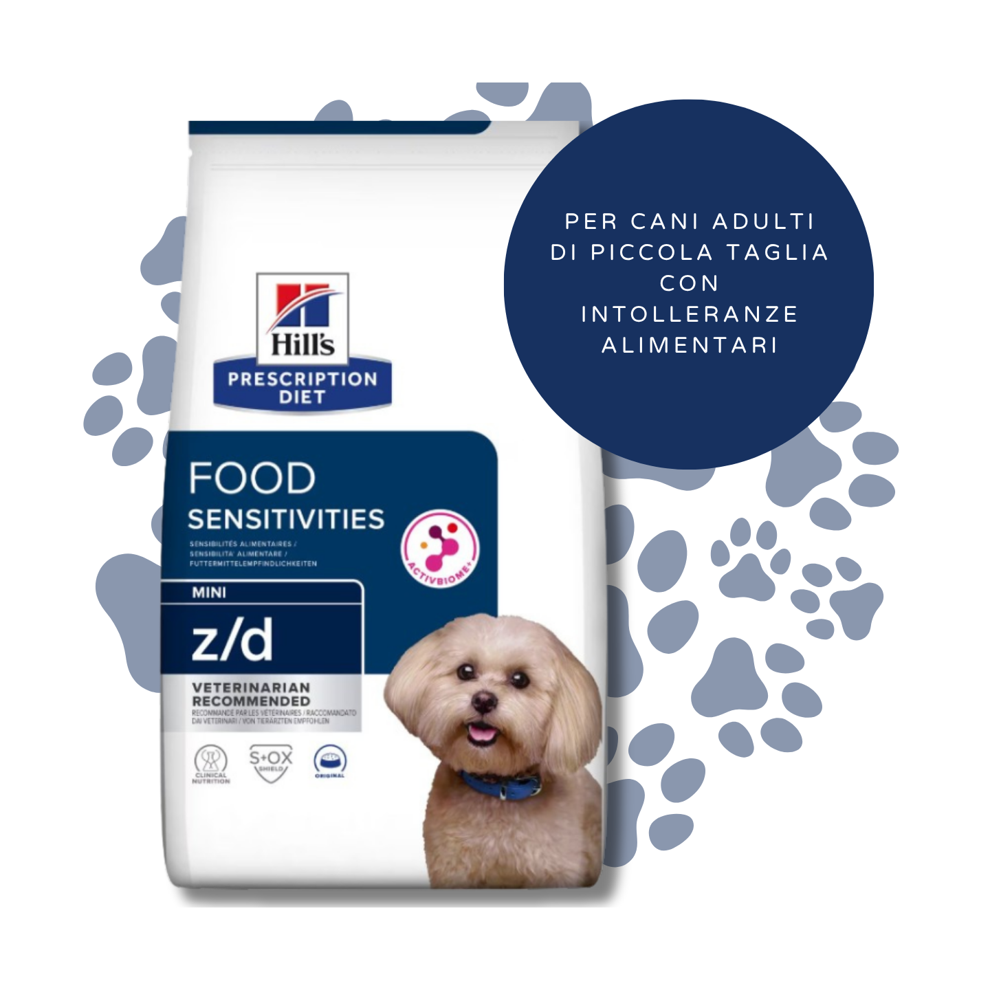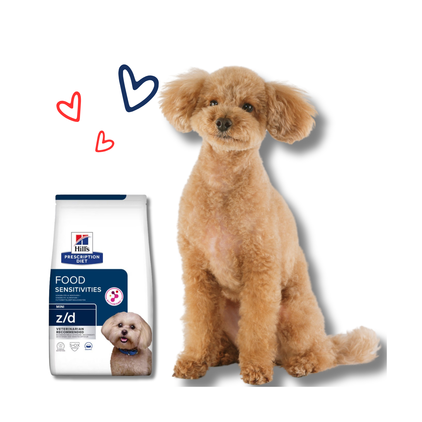 Quando il tuo cane mostra reazioni avverse al cibo — spesso a causa di una proteina — può avere bisogno di un’alimentazione studiata appositamente per proteggerlo e farlo sentire meglio. Per questo i nutrizionisti e i veterinari Hill’s hanno sviluppato Prescription Diet z/d Mini, una formula clinica con crocchette più piccole, perfette per i cani di piccola taglia, pensata per ridurre i segni cutanei e digestivi causati dalle intolleranze alimentari.