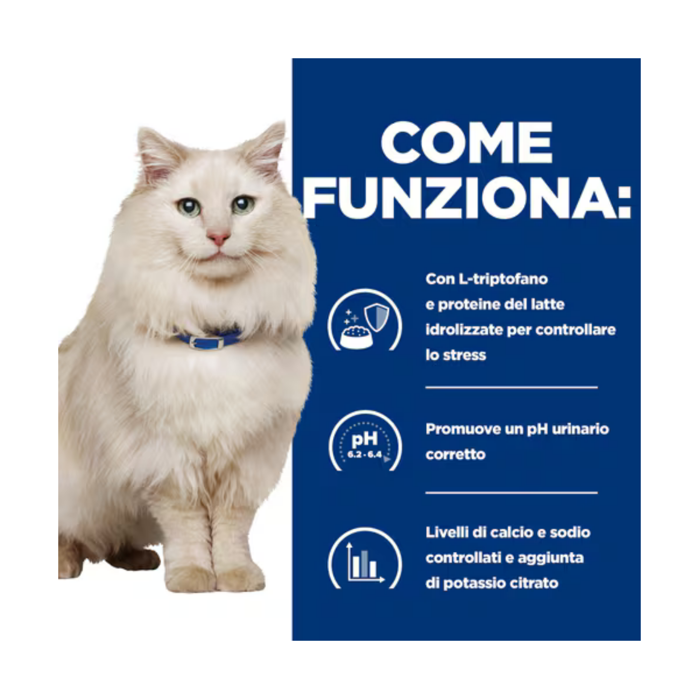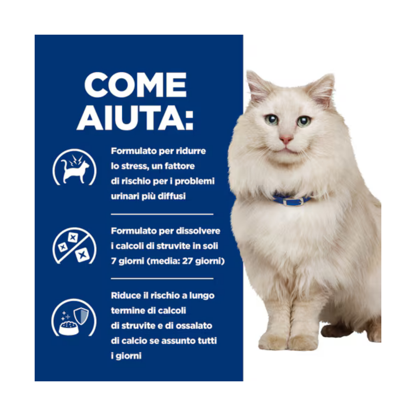 - Riduce il rischio a lungo termine di calcoli di struvite e ossalato di calcio quando viene somministrato quotidianamente