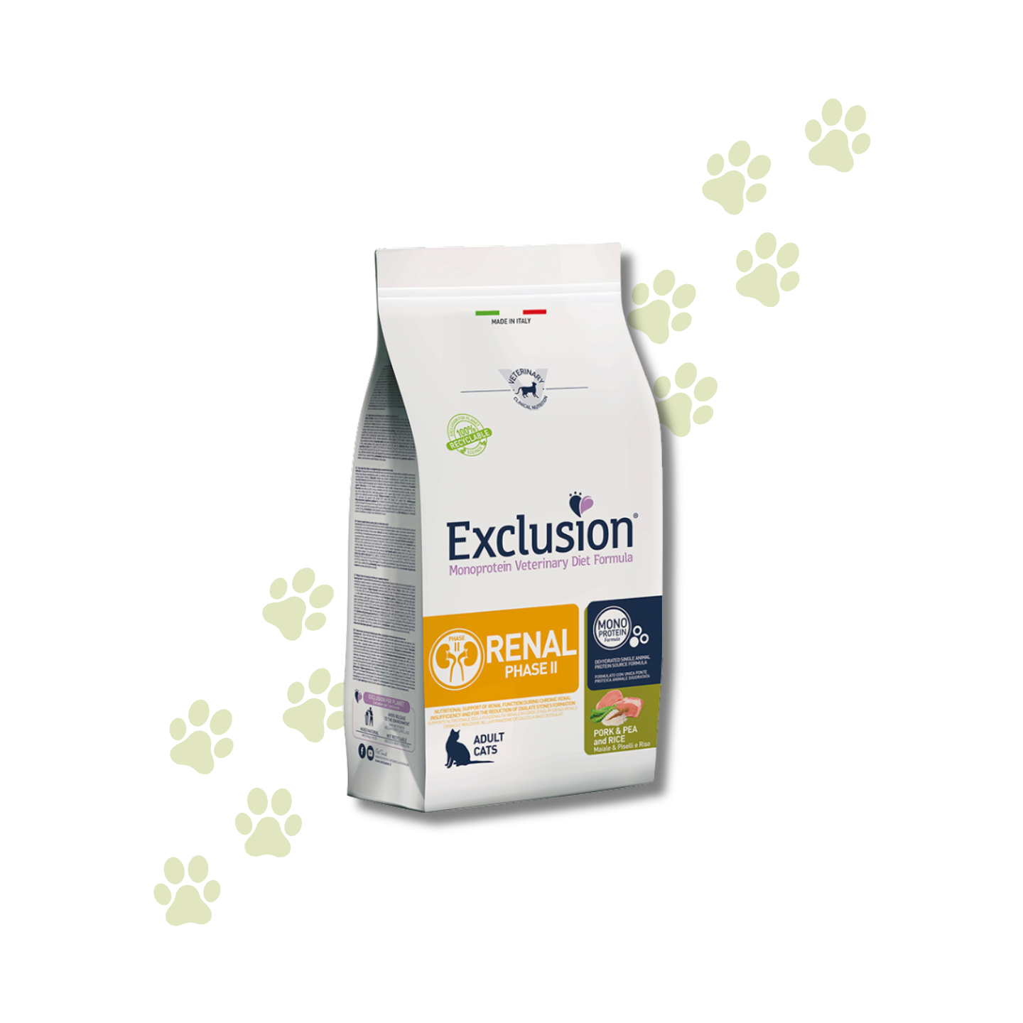 Exclusion Monoprotein Veterinary Diet Formula Renal Phase II Maiale e Piselli è un alimento dietetico completo per gatti adulti, specificamente formulato per supportare la funzione renale in caso di insufficienza renale cronica. Come la Fase I, presenta un ridotto tenore di proteine di elevata qualità e una bassa concentrazione di fosforo e sodio. È inoltre indicato per la riduzione della formazione di calcoli a base di ossalati, grazie alla bassa concentrazione di calcio, vitamina D e alle sue proprietà alcalinizzanti dell'urina. La sua formula monoproteica (maiale) e con due fonti di carboidrati, il complesso Microbiome Plus (FOS, MOS, GOS) e antiossidanti naturali.