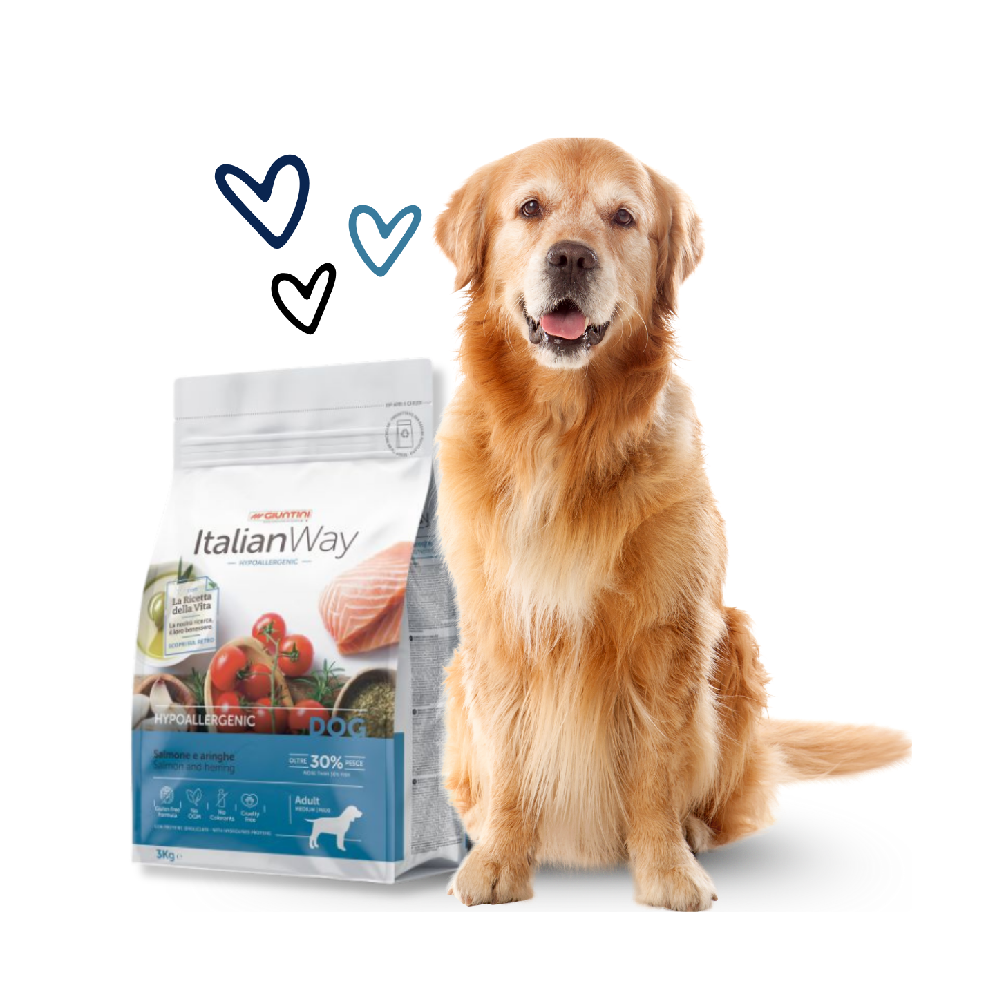 Il tuo cane di taglia piccola o mini ha una pelle sensibile o tendenza alle allergie? Italian Way Hypoallergenic Salmone e Aringhe è l'alimento completo e bilanciato specificamente formulato per lui.