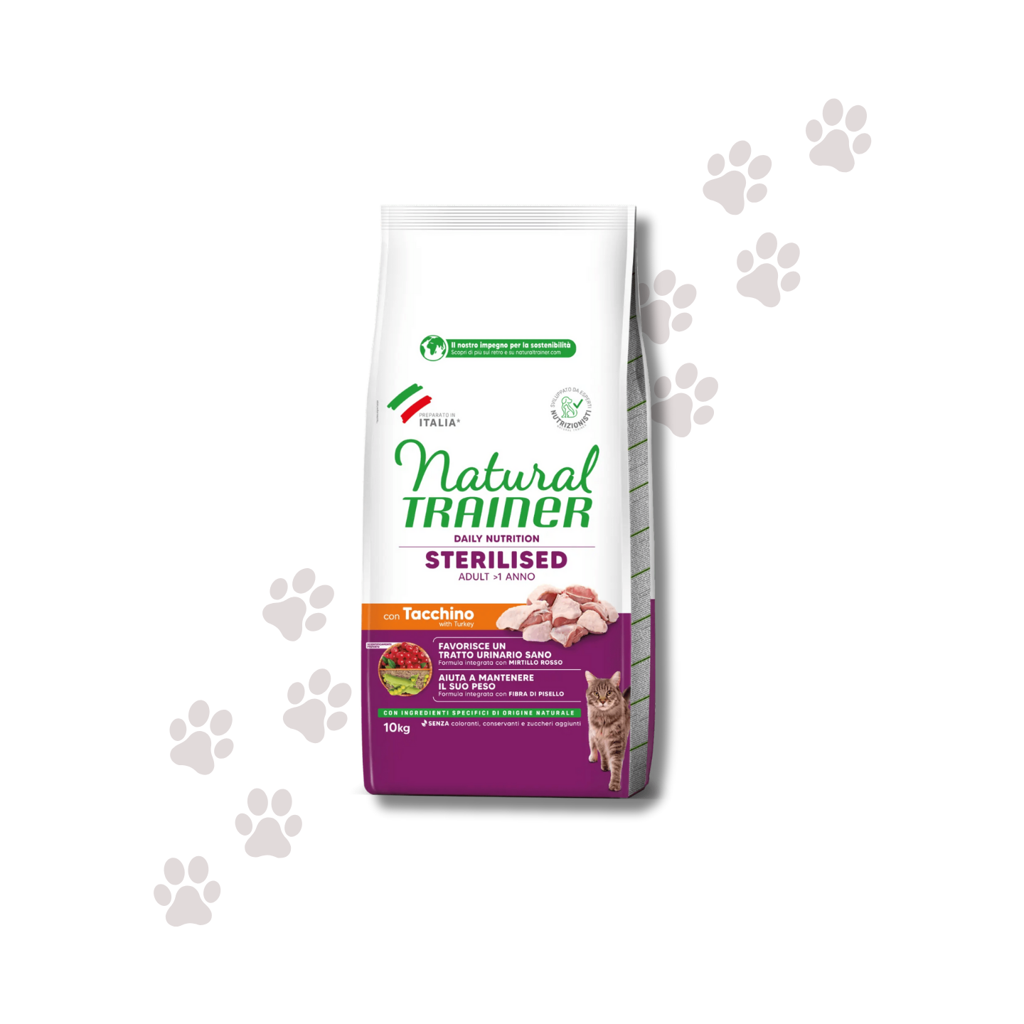 Natural Trainer Sterilised Tacchino è l'alimento secco completo e bilanciato, studiato per supportare la salute del tuo gatto adulto sterilizzato, aiutandolo a mantenere il peso forma e a prendersi cura del suo sistema urinario.