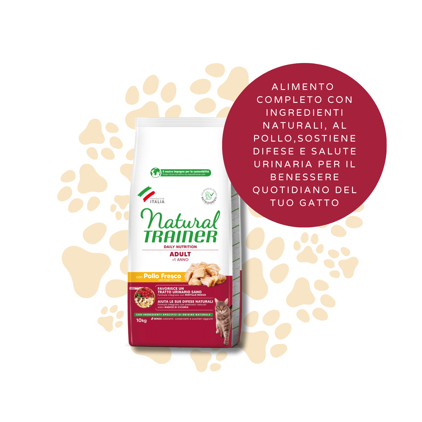 Vuoi assicurarti che il tuo gatto riceva un'alimentazione non solo deliziosa, ma anche funzionale al suo benessere quotidiano? Natural Trainer Cat Pollo è l'alimento secco completo e bilanciato, progettato per soddisfare le esigenze dei gatti adulti, combinando il sapore del pollo fresco con ingredienti naturali e benefici.