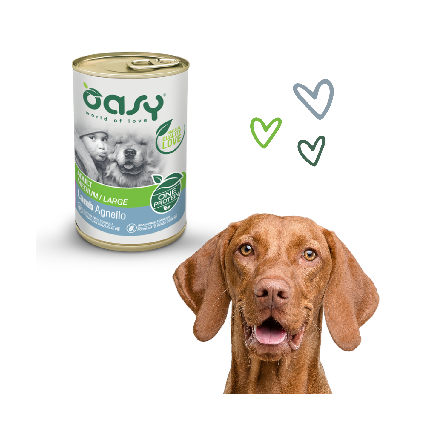 Offri al tuo cane un pasto che unisce il sapore autentico dell'agnello alla sicurezza di una formula monoproteica con Oasy ONE PROTEIN • Adult Medium/Large Agnello.
