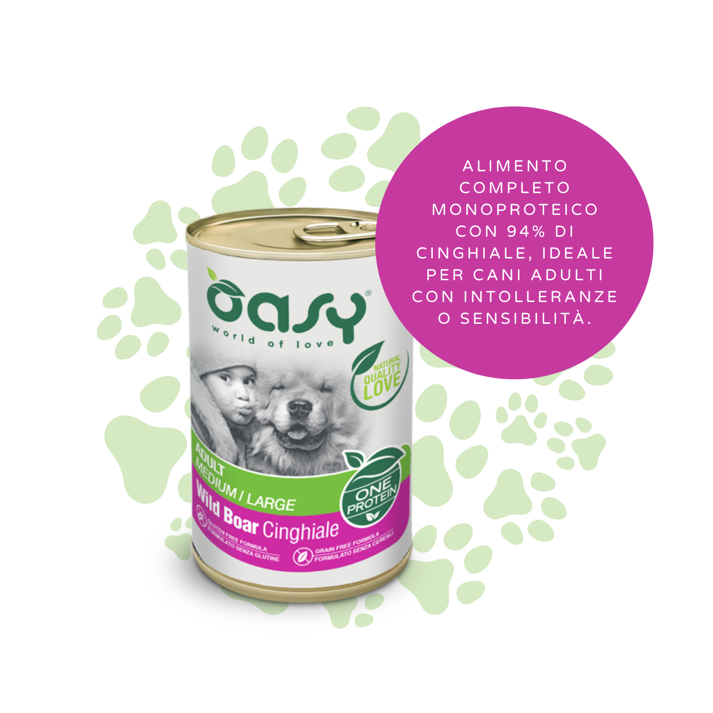 - Offri al tuo cane un'alimentazione su misura che unisce il gusto intenso del cinghiale alla sicurezza di una formula monoproteica con Oasy ONE PROTEIN • Adult Medium/Large Cinghiale.