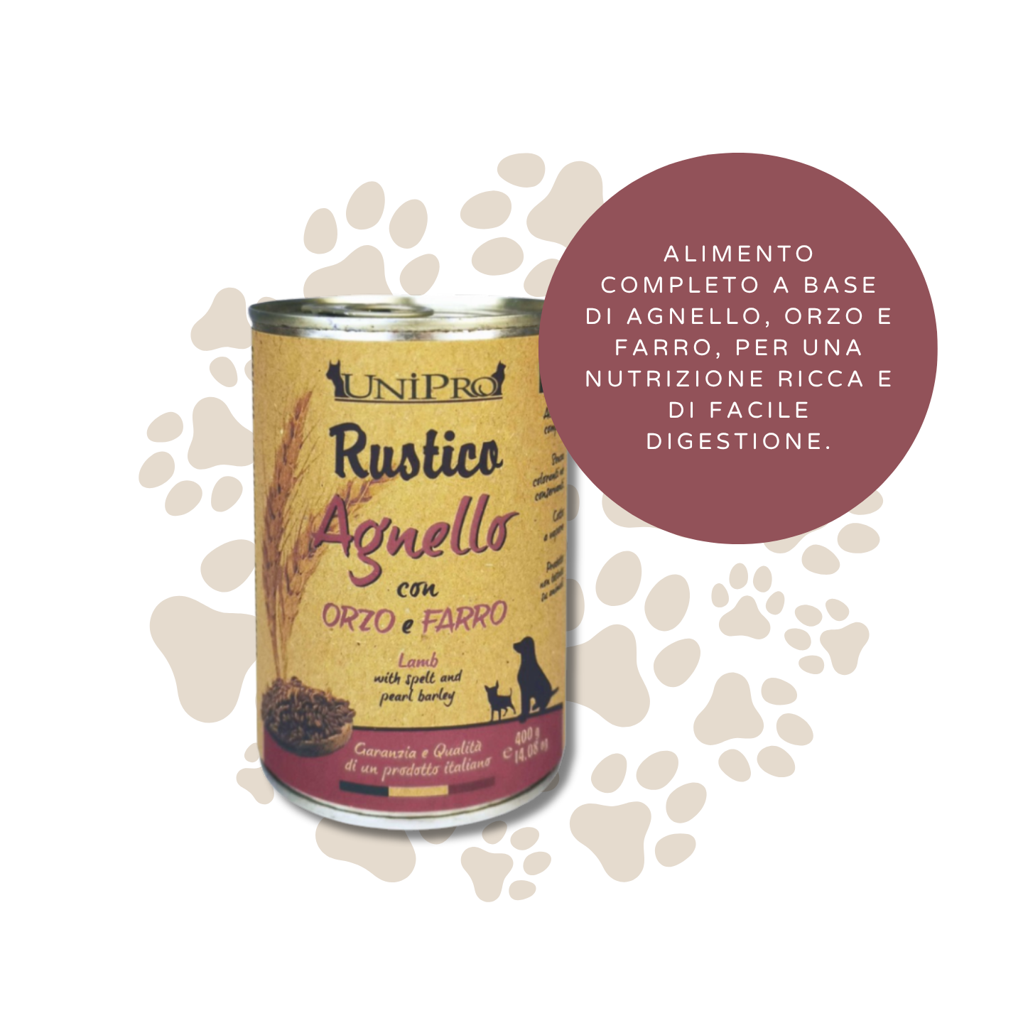 Offri al tuo fedele amico un pasto che unisce il sapore autentico della carne a una nutrizione bilanciata e facilmente digeribile. Unipro RUSTICO AGNELLO CON ORZO E FARRO è l'alimento completo, pensato per cani di tutte le razze e taglie, che porta nella ciotola del tuo animale la qualità e la tradizione del "Made in Italy".